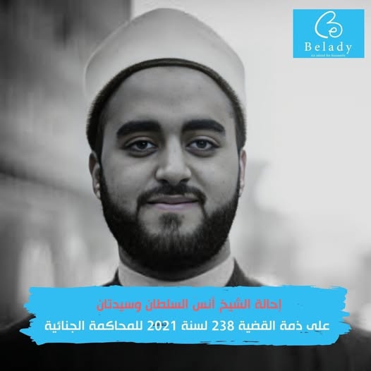 أحالت نيابة الانقلاب الداعية ، أنس حسن عثمان، الشهير بـ”شيخ العمود أنس السلطان”، وكل من إيمان يسري محمد مصطفى، وآلاء محمد يوسف عيسى، ومحمد طارق بيومي -المقبوض عليه وهو طفل-، على أمر للمحاكمة الجنائية على خلفية اتهامهم في القضية الهزلية رقم 238 لسنة 2021 حصر أمن الدولة العليا باتهاماتٍ أبرزها الانضمام إلى جماعةٍ إرهابية، وارتكاب جريمة من جرائم تمويل الإرهاب.