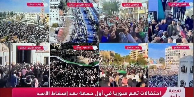 وتوافد آلاف السوريون، إلى الساحات والميادين العامة في عموم المناطق السورية للاحتفال بإسقاط نظام الهارب بشار الأسد، وهم يحملون علم الثورة.