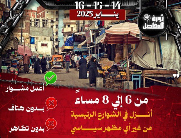 خلال الـ24 ساعة الماضية انتشرت عبر مواقع التواصل الاجتماعي، كثف العديد من النشطاء تدويناتهم على #ثورة_المفاصل مطالبين المصريين للنزول للشوارع الرئيسية أيام “14-15-16″من الساعة 6 إلى 8 مساءا دون أي مظهر سياسي وذلك للمطالبة برحيل قائد الانقلاب عبد الفتاح السيسي، تزامنًا مع الروح المعنوية التي انتشرت بين المصريين بعد نجاح الثورة السورية، وقرب ذكرى ثورة 25 يناير.