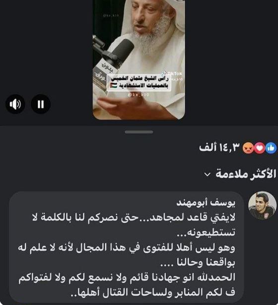 وعن صاحب الرد قال هو يوسف عاشور “أبو مهند” تقبله الله، الذي يتهمه #عثمان_الخميس أنه ينتمي لجماعة منحرفة، وأنه سيسعى لهدمها إذا انتهت الحرب!!”.
