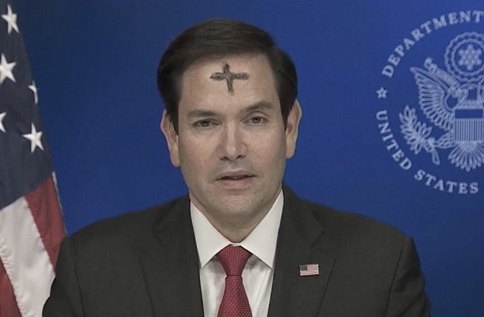 وزير الخارجية الأميركي ماركو روبيو يرسم الصليب على جبهته خلال لقاء صحفي لمناقشة مواقف ترامب حول غزة وحماس وأوكرانيا‼️