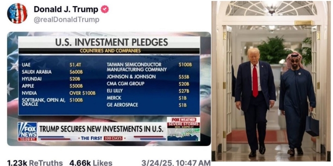 تقرير فوكس نيوز عن دور الرئيس ترامب في جذب استثمارات غير مسبوقة إلى الولايات المتحدة فوضعت في المقدمة الإمارات ب1.4 تريليون، والمملكة العربية السعودية 600 مليار في حين تستثمر هيونداي 20 مليار و أبل 500 مليار ونفيديا 100 مليار .