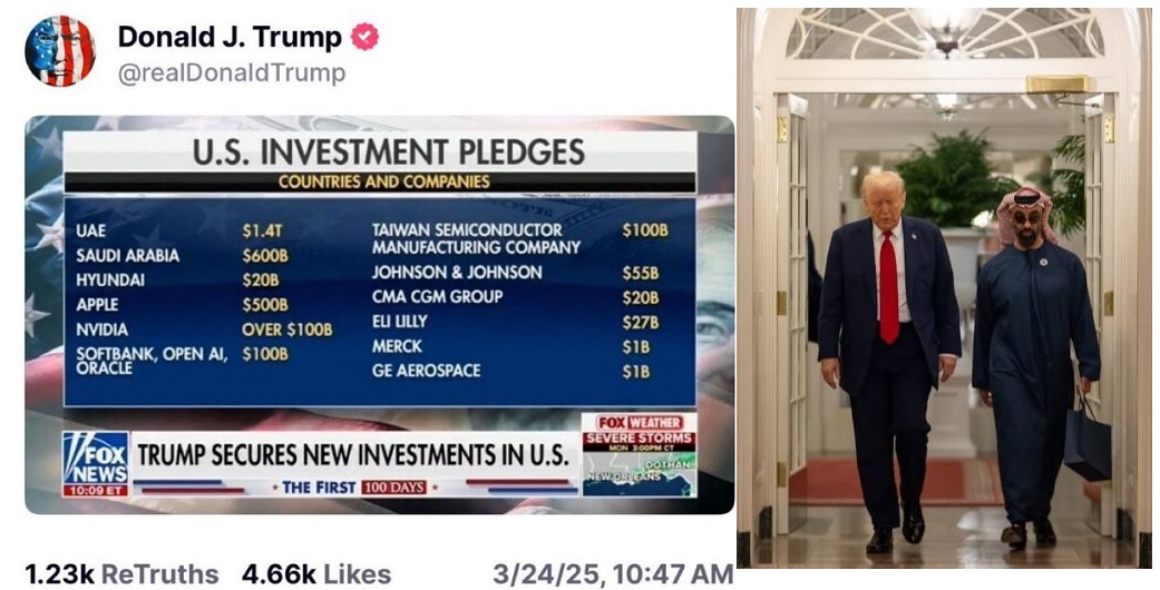وبعد إعلان الأمير محمد بن سلمان نيّة المملكة العربية السعودية استثمار 600 مليار في الولايات المتحدة لمدة 4 سنوات، طالبه ترامب بتريليون دولار فاستجاب ورفعها، وإذ بالإماراتيين يعلنون إلتزامهم باستثمار تريليون و400 مليار دولار أيضًا في الولايات المتحدة لمدة ١٠ سنوات.