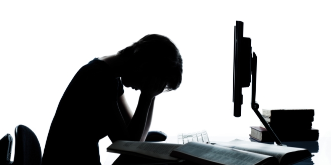 one caucasian young teenager silhouette boy or girl studying with computer computing laptop tired sad despair in studio cut out isolated on white background