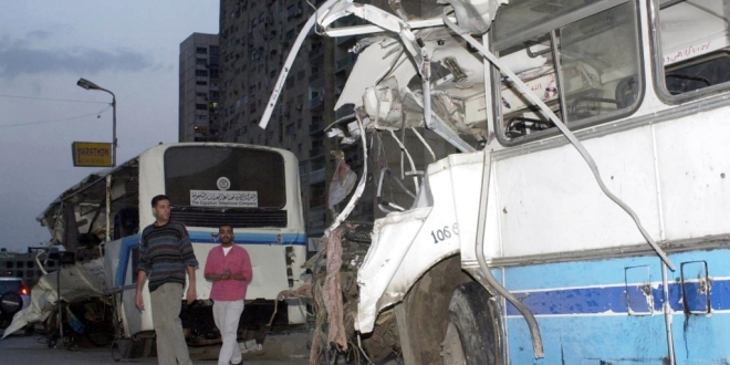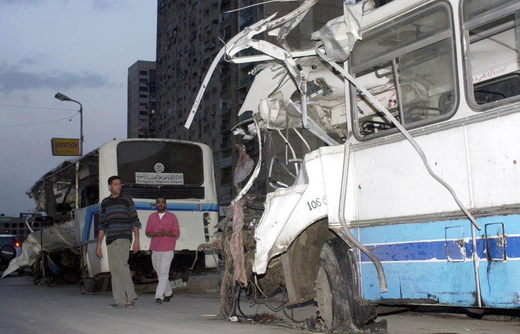 A picture shows the two damaged buses that collided on a Nile-side road in southern Cairo killing 13 people and wounding 55, 11 November 2003. Witnesses said the accident occurred when one bus burst a tire, flipped over and hit the other bus in the oncoming lane of a road. AFP PHOTO/DASSKI (Photo by DASSKI / AFP)