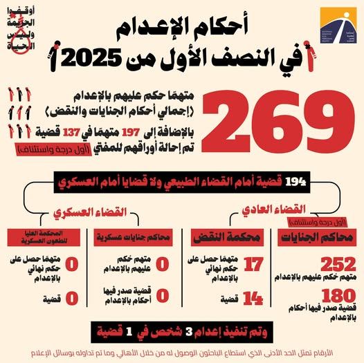 بحسب التقرير، أصدرت المحاكم المصرية خلال النصف الأول من 2025 أحكامًا بالإعدام على 269 متهمًا في 194 قضية، وأحالت أوراق 197 آخرين للمفتي في 137 قضية، في خطوة تمهيدية للإعدام. 17 حكمًا أصبح نهائيًا لا يقبل الطعن، ما يعني قرب تنفيذها.