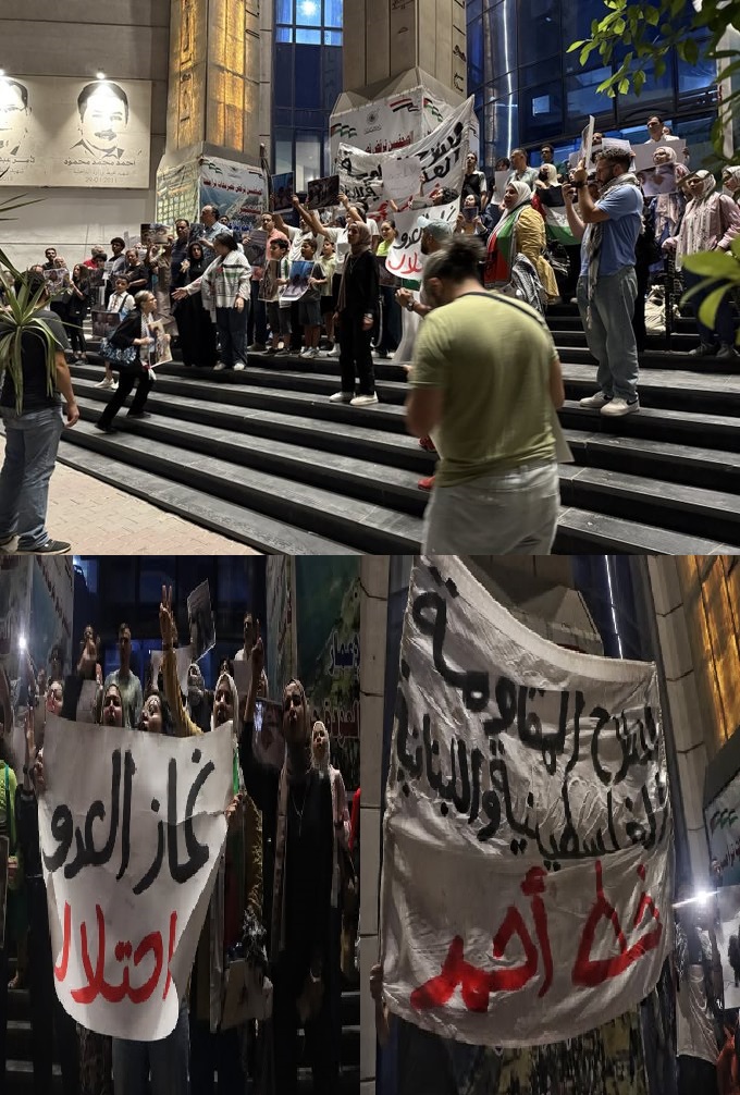 تظاهر مصريون وناشطون أمام نقابة الصحفيين رفضا لمحاولات نزع سلاح المقاومة إضافة لرفضهم صفقة الغاز مع الاحتلال التي وقعها السيسي ووصلت قيمتها إلى 35 مليار دولار وحتى 2040، ونوه الناشطون إلى أنه السبت 16 أغسطس 2025 في السادسة مساءً بالدور الرابع بنقابة الصحفيين، فعالية تضامنية مع الصحافة الفلسطينية تتضمن معرض صور، إيقاد شموع، شهادات من غـزة، عرض فيلم عن التجويع، وكلمات لنقابيين عرب ودوليين، مع تكريم شـهداء الصحافة الفلسـطينية.