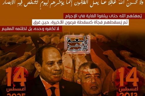 وذكر أن جريمة فض رابعة والنهضة لم يحاسب بعد فاعلها، ذكرى المجزرة التي هزت ضمير العالم.
