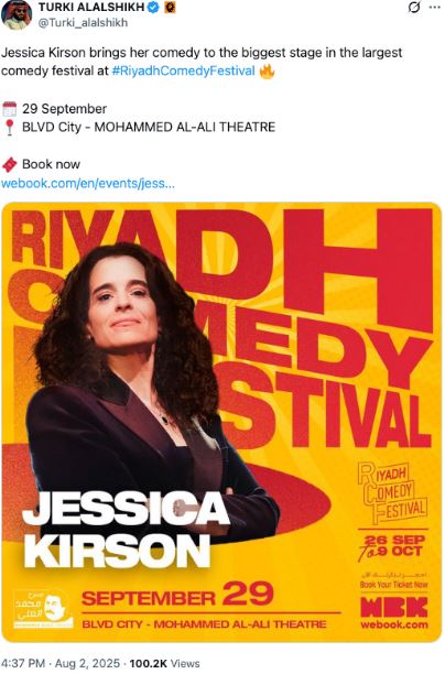 وساندت حسابات عدة ما رصده "مفتاح"، منها حساب نحو الحرية @hureyaksa الذي نشر تغريدات عن تصريحات جيسيكا المسيئة للسعودية رغم منحها دورًا رئيسيًا في مهرجان الكوميديا السعودي 2025.