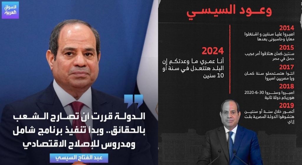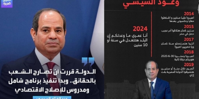أعاد ناشطون الحديث عن وعود المنقلب عبدالفتاح السيسي التي تذكروها له مع الانتكاسات المتتابعة التي يمر بها المصريون، ومع إعادة الصحف "لقومية" تصدير عناوين أن تصريحات السيسي "صراحة.. حقائق.. طمأنة"! وخلال الأشهر الماضية أكد عبد الفتاح السيسي في أكثر من خطاب أن الدولة "قررت أن تصارح الشعب بالحقائق"، خصوصًا فيما يتعلق بالأوضاع الاقتصادية الصعبة والإجراءات الإصلاحية التي اتخذتها الحكومة، مشددًا أن هذه القرارات كانت بمثابة "علاج صعب لكنه الأصح" لإنقاذ الاقتصاد المصري.