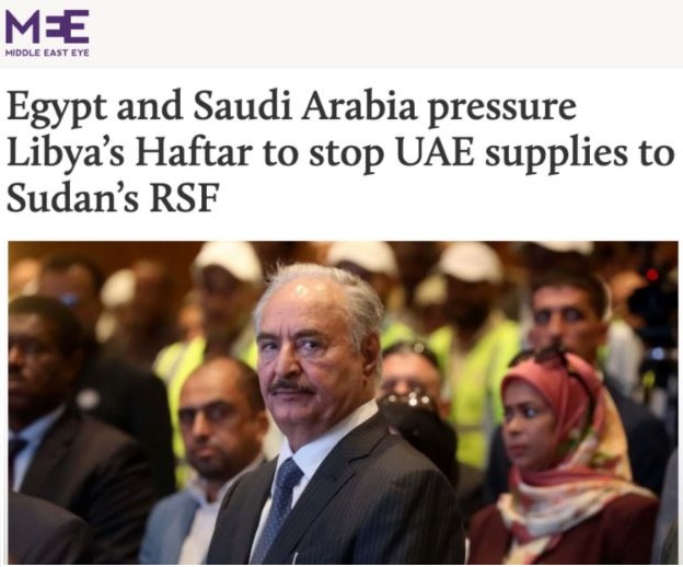 وبحسب تقرير موقع "ميدل إيست آي"، فإن مصر والسعودية تمارسان ضغوطًا متزايدة على خليفة حفتر بسبب دوره في تسهيل الدعم العسكري الإماراتي لقوات الدعم السريع السودانية. هذا الضغط يأتي ضمن جهد أوسع لمنع تدفق الأسلحة والوقود والمقاتلين إلى قوات الدعم السريع، والحد من نفوذ الإمارات في المنطقة، خاصة على طول المثلث الحدودي الحساس بين مصر وليبيا والسودان.