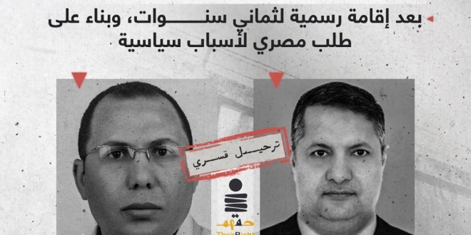 كما رصدت أيضا ترحيل وتسليم مهندس الكمبيوتر محمد العراقي سعد حسانين، 45 سنة، وأب لثلاثة أبناء ومقيم بمملكة البحرين بصفة قانونية منذ 8 سنوات، والمحكوم عليه بالسجن المؤبد غيابيا في القضية المعروفة إعلاميا بمذبحة فض اعتصام رابعة من محكمة افتقدت الإجراءات فيها إلى أدنى معايير المحاكمات العادلة، و بناء على ادعاءات تفتقر إلى المصداقية.