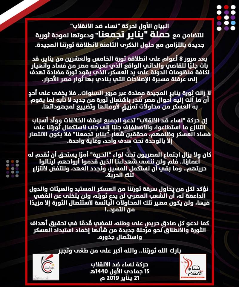 أعلنت حركة “نساء ضد الانقلاب” عن تضامنها مع حملة “يناير تجمعنا” ودعوتها إلى موجة ثورية جديدة، بالتزامن مع حلول الذكرى الثامنة لانطلاقة ثورة يناير. وقالت الحركة، في بيان ...