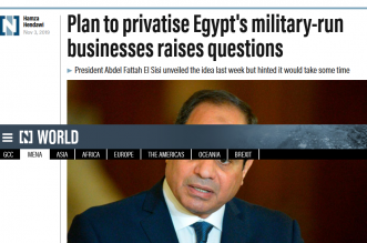 قال حمزة هنداوي، محرر صحيفة “ذا ناشيونال” التي تصدر بالإنجليزية في أبو ظبي، تحت عنوان “خطة لخصخصة الشركات التي يُديرها الجيش في مصر تثير أسئلة”: إن عبد الفتاح ...