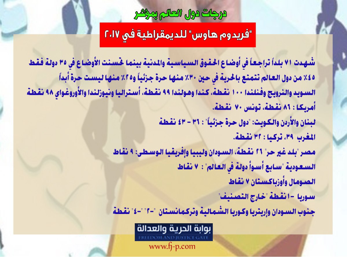 كشف مؤشر “فريدوم هاوس” للديمقراطية والحريات الصادر أمس، عن تردي أوضاع الحريات والديمقراطية في العديد من دول العالم، وصنفت مصر كدولة غير حرة، لقمعها حريات التعبير والصحافة والاعتقالات ...