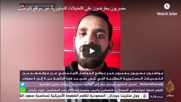 بثت قناة “الجزيرة مباشر” تقريرا مصورا لعدد من المواطنين يؤكدون رفضهم لمحاولات عبدالفتاح السيسي قائد الانقلاب ترقيع الدستور وتعديل فترة الرئاسة ليظل في الحكم مدى الحياة. وخلال الفيديو، ...