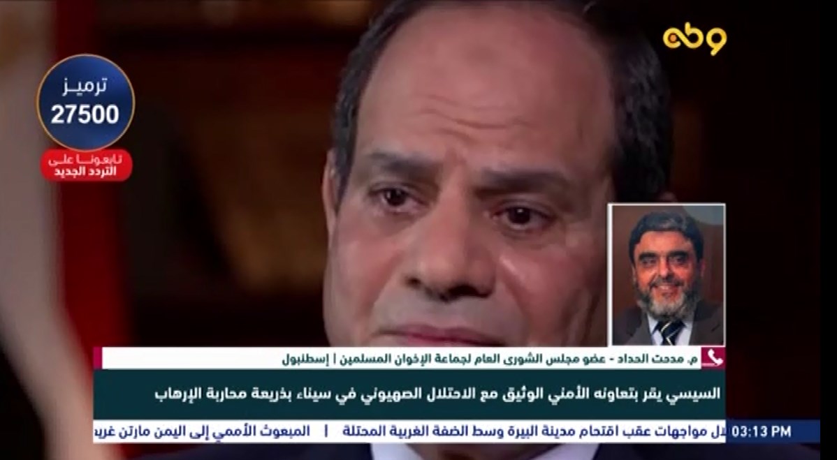 اعترف قائد الانقلاب العسكري عبد الفتاح السيسي، بتعاونه العسكري الوثيق مع دولة الاحتلال الإسرائيلي بشبه جزيرة سيناء بذريعة مكافحة الإرهاب. وقال السيسي، خلال مقابلة تلفزيونية مع برنامج 60 ...