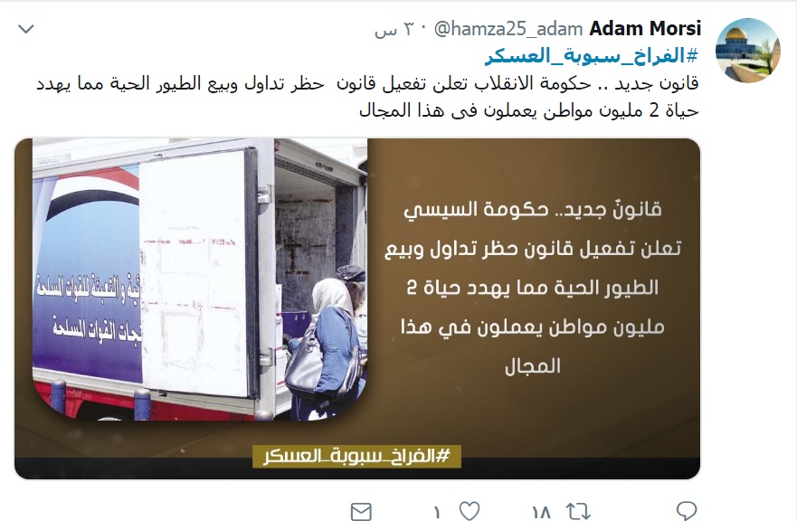 أطلق نشطاء على مواقع التواصل الاجتماعي هاشتاج #الفراخ_سبوبة_العسكر عقب إصدار حكومة الانقلاب قرارا بمنع محال بيع الفراخ المحلية الحية من مزاولة عملها، وتغيير نشاطها إلي بيع الفراخ المجمدة ...