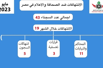 رصد المرصد العربي لحرية الإعلام في تقريره عن انتهاكات حرية الإعلام في مصر خلال شهر مايو المنقضي 19 انتهاكا تصدرها انتهاكات المحاكم والنيابات ب”11″ انتهاكا، وبلغت الانتهاكات ...