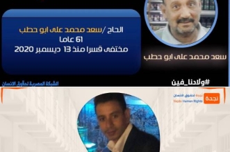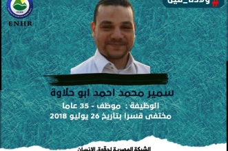 دانت “الشبكة المصرية لحقوق الإنسان” استمرار جريمة إخفاء سمير محمد أحمد أبو حلاوة منذ اعتقاله تعسفيا يوم 26 يوليو 2018 من قبل قوت أمن الانقلاب بالجيزة واقتياده لجهة ...