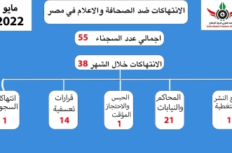 وثق المرصد العربي لحرية الاعلام 38 انتهاكات خلال شهر مايو المنقضى بما يعكس تواصل وتصاعد الانتهاكات بحق حرية الصحافة حيث تراجعت مصر إلى المركز 168 عالميا لعام ٢٠٢٢، ...