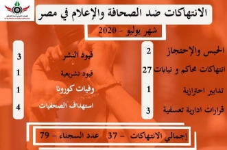 وثّق تقرير المرصد العربى لحرية الإعلام عن انتهاكات شهر يوليو المنقضى 37 انتهاكا واستمرار حبس 79 صحفيا وإعلاميا داخل سجون نظام السيسى المنقلب، ووفاة الصحفي محمد منير بسبب ...