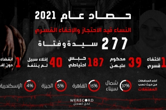 رصدت منظمة "نحن نسجل" الحقوقية في حصادها عن عام 2021 احتجاز وإخفاء 277 سيدة وفتاة، بينهن 187 قيد الحبس الاحتياطي و10 مختفيات قسريا و39 محكوم عليهن و40 سيدة حاصلة على إخلاء ...