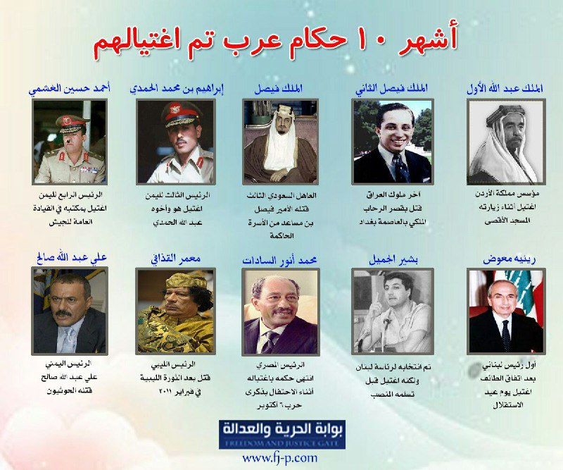 بمقتل الرئيس اليمني المخلوع علي عبد الله صالح، أول أمس الاثنين، يكون 10 حكام عرب تم اغتيالهم، منتقلين من على كراسي الحكم إلى القبور، ولم تنفعهم التشديدات الأمنية، ...