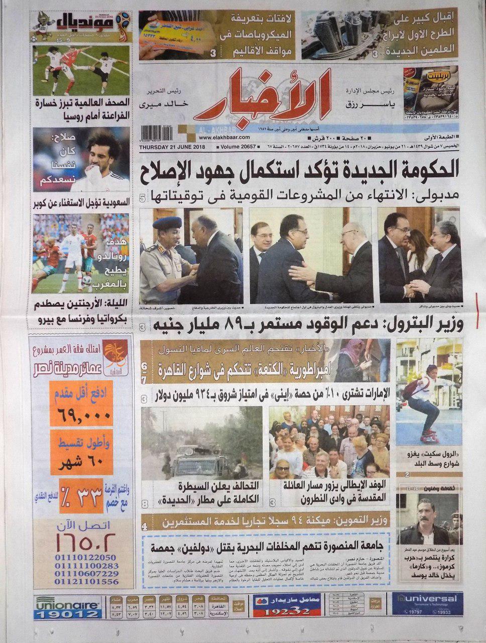 من المثير في صحف الأحد، أن صحيفة الأهرام الحكومية أولت اهتمامها الأول لاستقبال الجنرال عبدالفتاح السيسي رئيس الانقلاب للاعبي المنتخب الوطني قبل سفرهم للمشاركة في كأس العالم بروسيا ...