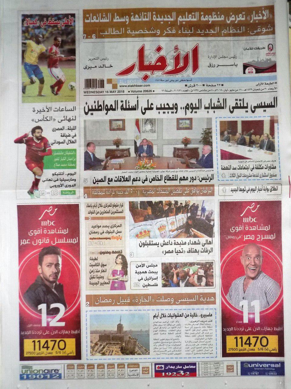 تصدرت أخبار الانتفاضة الفلسطينية في ذكرى النكبة مانشيتات وعناوين الحصف الخاصة بينما تصدر لقاء الجنرال عبدالفتاح السيسي مع مدير المخابرات الفرنسية واستعداده لمؤتمر الشباب غدا الأربعاء مانشيتات الصحف ...